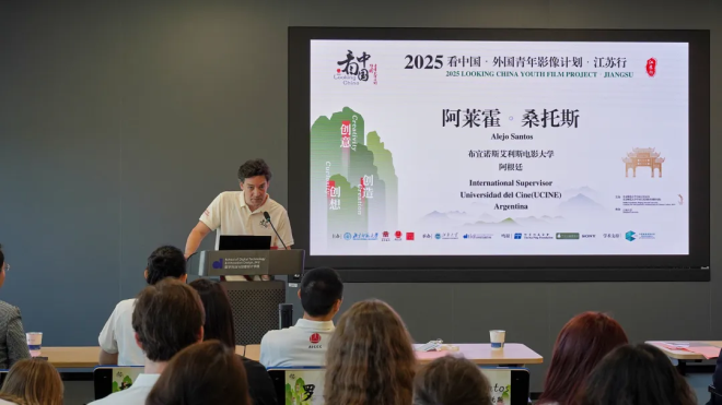 4月14日,2025“看中国·外国青年影像计划·江苏行”启动仪式在江南大学霞客湾校区顺利举行。校党委副书记倪松涛,北京师范大学中国文化国际传播研究院副院长罗军,外方指导教师阿根廷布宜诺斯艾利斯电影大学阿莱霍·桑托斯,数字科技与创意设计学院党委书记胡振宇,数字科技与创意设计学院院长曹鸣,项目组委国际交流合作处副处长蔡建英等领导与老师,以及来自阿根廷、美国、匈牙利、巴西等国家的10位外国青年导演与中方志愿者齐聚一堂,共同见证项目的正式启动。启动仪式由蔡建英主持。