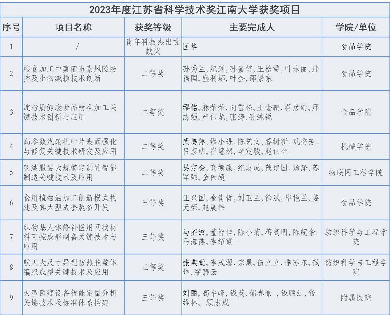 2023年度江苏省科学技术奖江南大学获奖项目