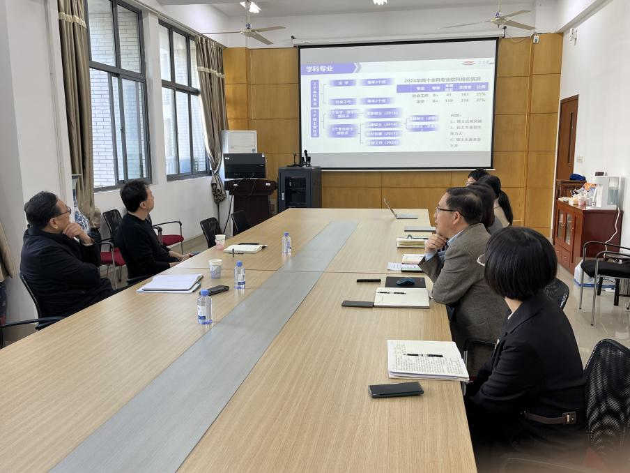 学院院长王君柏首先汇报了学院基本情况及发展设想,他全面介绍了师资队伍、学科专业、学科平台、科研亮点、社会服务、育人成果等方面取得的成绩及目前存在问题,并就挖掘教师潜力、提升社会服务水平、博士点申报等方面提出未来设想和发展思路。陆敏芝汇报了学院党委的基本情况,重点介绍了在深化党的政治建设、突出党的思想建设、增强党的组织功能等方面的具体工作举措。提出了加强“一融双高”建设、强化党建工作辐射效应和品牌化建设的下一步工作思路。与会其他领导也分别围绕学生培养、科研管理、教育教学等方面进行了汇报。