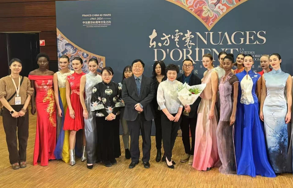 在中法建交60周年之际,12月19日,巴黎卢浮宫举办了由五洲传播中心和法国造型艺术家协会共同主办的“中国传统艺术巴黎交流展”和“东方云裳巴黎绽放之夜时装秀”。江南大学数字科技与创意设计学院牛犁教授团队携10套华服应邀参加,江南设计闪耀巴黎。