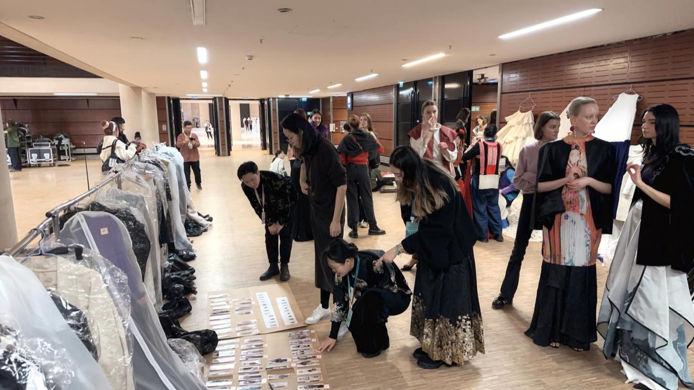 主创团队牛犁、张婧楠、丛天柱在卢浮宫秀场后台