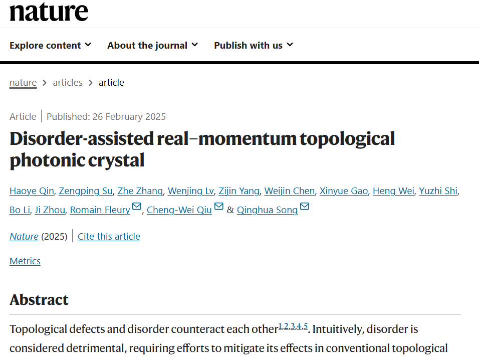 2月26日,国际顶尖学术期刊《Nature》在线刊发了一项题为“Disorder-assisted real–momentum topological photonic crystal”的重要研究成果。江南大学理学院光学工程2022届硕士毕业生苏增平在这项研究中担任共同第一作者。
