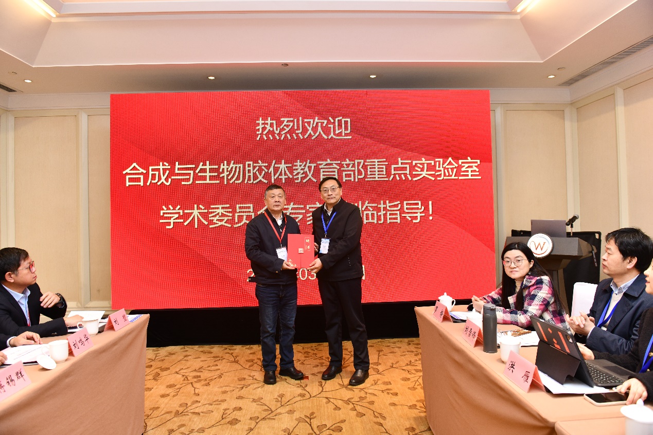 合成与生物胶体教育部重点实验室第三届学术委员会第一次会议于3月29日在江南大学召开。出席本次会议的学术委员会专家有:中国工程院院士、四川大学石碧教授,华南理工大学张广照教授,山东大学郝京诚教授,清华大学杨振忠教授,北京大学黄建滨教授,南京大学蒋锡群教授,上海交通大学周永丰教授,中科院化学研究所刘鸣华研究员,华东理工大学杜建忠教授,吉林大学刘堃教授,中科院长春应用化学研究所陈全研究员,江南大学刘仁教授。江南大学党委书记吴正国教授,合成与生物胶体教育部重点实验室主任、江南大学副校长顾正彪教授,科学技术研究院副院长樊启高教授,化学与材料工程学院党政领导班子及重点实验室骨干成员参加了本次会议。开幕式由科学技术研究院副院长樊启高教授主持,吴正国为重点实验室第三届学术委员会委员颁发聘书。
