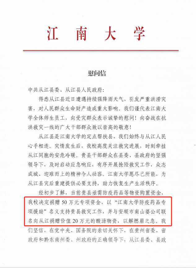 经与从江县紧急对接得知,当地急需救援装备及防疫药品等物资,但因资金短缺面临采购困难,江南大学积极响应,决定捐赠50万元专项资金用于支持从江县购买防疫药品等保障物资,助力从江县防汛救灾工作,保障受灾群众健康需求。同时,学校联合安顺市南山婆公司,向从江县捐赠价值20万元的酸汤物资,助力解决受灾群众生活所需。