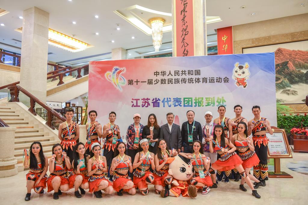 自我校2017年9月成为无锡市少数民族传统体育项目训练基地起,体育部就组建了民族健身操、蹴球、毽球、板鞋竞速、珍珠球等具少数民族特色的体育项目运动队,并开始常年训练。出色的工作成效,使我校今年被江苏省民委和省体育局授予江苏省少数民族传统体育项目训练基地。本次民族健身操项目备战全国民运会,组建了由体育部徐清香和人文学院刘俊两位老师的教练组,通过深入民族地区实地调研,精心编排了自选曲目,运动员分别来自人文学院、理学院、法学院、商学院及数媒学院,涵盖汉族、回族、壮族、彝族、蒙古族、满族、朝鲜族、侗族及维吾尔族等9个民族,经过近十个月的刻苦训练,达到了较高的竞技水平,并代表江苏代表团参加开幕式驻停表演。