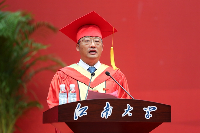 陈卫发表了题为《奋进者 共青春》的讲话,向2022届毕业生们送上最热烈的祝贺与最诚挚的祝福,向相伴同学们成长的老师、家人和工友们,致以最崇高的敬意和最衷心的感谢。陈卫表示,这几年,学校在各项工作中表现抢眼,一个又一个高质量发展成果,凝聚着全校师生的艰辛努力,同学们的优异成绩令人感到骄傲和自豪。他对毕业生们提出三点希望,希望他们矢志拼搏,做笃行不怠的奋进者;希望他们团结互助,做同心向前的奋进者;希望他们融入时代,做胸怀家国的奋进者。今年党的二十大即将召开,期待未来大家能和母校一起保持奋进的姿态,一路奋进一路青春,让“奋进”成为每一位江南人身上最鲜明的底色。祝福大家一帆风顺,前程似锦,载誉江南!陈卫热情洋溢的讲话赢得了在场师生的阵阵掌声。
