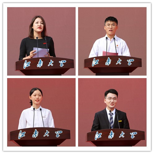 化学与材料工程学院朱叶老师代表全体教师发言,她期望全体新生能够珍惜当下,注重积累,认真对待每一件事;做最好的自己并心存感激,常思回报;明确目标并持续努力,享受成长的痛苦和进步的快乐。食品学院余柳锋同学代表在校生发言,他号召江南学子“在追问中求思,在反思中明理”,向下深深扎根,向上努力生长,成就不一样的自己,镌刻最奋进的青春。人文学院陈炀杨代表本科新生发言,倡议同学们知止而后有定、笃学而后能得、尚行以求至善,带着满腔的热忱和对梦想的执着,做一个敢闯敢拼、闪闪发光、顶天立地的江南人。纺织科学与工程学院王傲代表研究生新生发言,呼吁同学们要有“千磨万击还坚劲”的热爱坚持,还要有“线多搓绳挑千斤”的聚力同行,更要有“报国寸心坚似铁”的少年意气,扎根专业、默默耕耘,奋力开启“问天探海,奋进致远”的新征程。