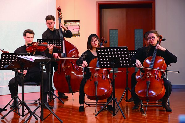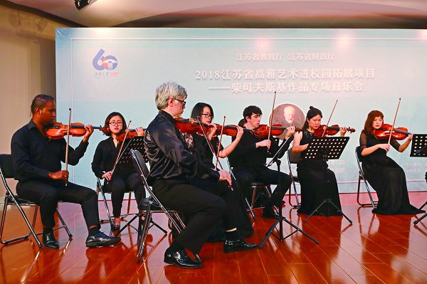 一串音符,成就舞台间的吟唱;一组乐器,演绎人生的悲欢无常。“音乐天才”莫扎特、“乐圣”贝多芬、“歌曲之王”舒伯特……你是否曾称羡他们艺术人生的辉煌,对西方古典音乐心生向往?打开留声机,听一首圆舞曲,让我们走近西方古典音乐的世界,共赴一场浪漫之约。10月23日晚,由江苏省教育厅和江苏省财政厅主办的2018年江苏省高雅艺术进校园拓展项目———柴可夫斯基作品专场音乐会在我校北区大学生活动中心音乐厅举办。亚历山大室内乐团受邀为我校师生带来了一场绝妙的音乐盛宴。