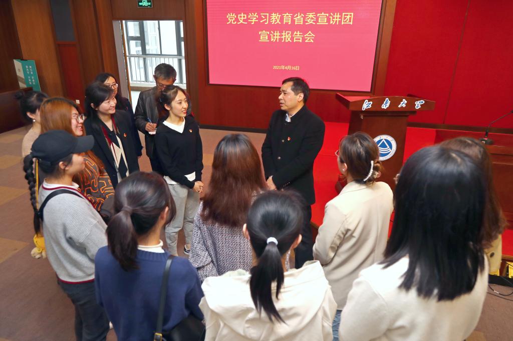 4月16日下午,按照省委统一部署,党史学习教育江苏省委宣讲团宣讲报告会在我校举行。省委宣讲团成员、江苏省委党校党史党建部副主任周延胜以《中国共产党百年的奋斗与辉煌》为题作党史专题宣讲。校党委书记朱庆葆主持报告会。