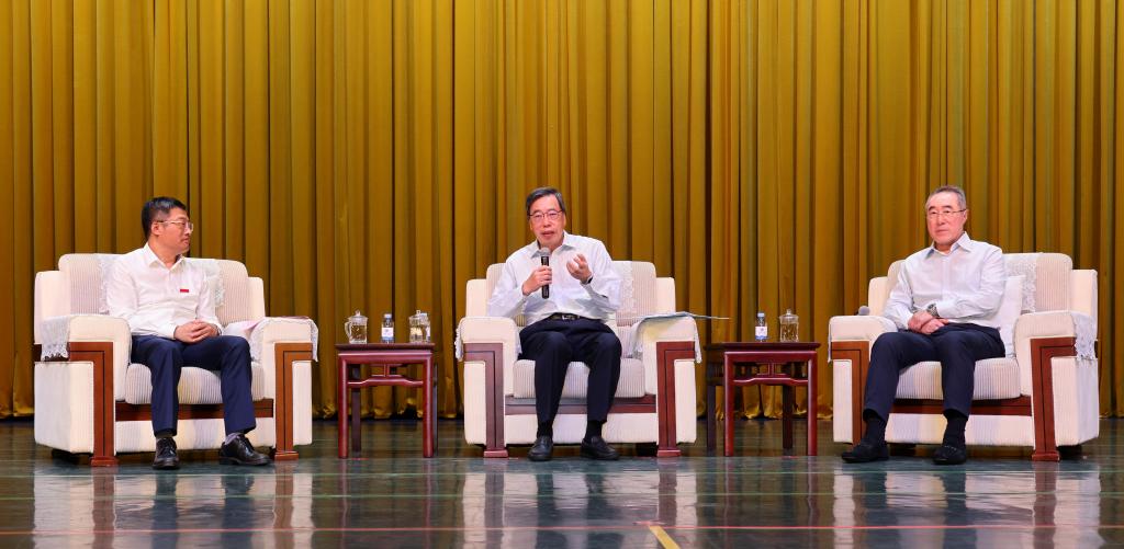 访谈环节,陈卫与梁君彦、唐英年一起展开了配合默契的交流,回顾了唐翔千先生爱国爱港的感人事迹,以及唐英年继承唐翔千先生爱国爱港思想与情怀,对爱国者治理香港、发展香港所做出的巨大贡献;还围绕大湾区和长三角的优势互补与共同发展,聚焦高等教育,特别是两岸青年人才的互动交流与发展进行了深入探讨。