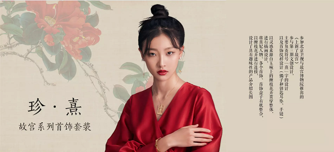 郭越主要负责“珍熹”首饰“熹”字符号化设计和手镯、手链的纹饰设计。“珍熹”首饰套装整体的灵感来源主要是白玉碗的红宝石藤蔓图案,郭越提取熹妃住所的文物黄花梨雕刻云龙顶竖柜中的八宝莲纹,与熹字结合,进行了简约的“熹”符号设计,又将白玉碗上精美的红宝石图案解构为指环,将熹妃的历史文化内核精巧凝练在首饰当中。再者,她也将熹妃人物形象、首饰、首饰藏宝盒与藤蔓图案糅合成图展示在产品说明长图里。郭越还主要负责了“十公主童顽故宫儿童游戏棋”包装视觉设计、结构完成,地图棋盘设计以及人物棋子的造型、配色优化,这款万众期待的游戏棋包装外形为十分精美写实的宫殿,从结构到纹案,无一不体现故宫建筑的华美典雅,外层镂空的窗户通过顶部旋转能看到公主成长的历程,极富童趣性。