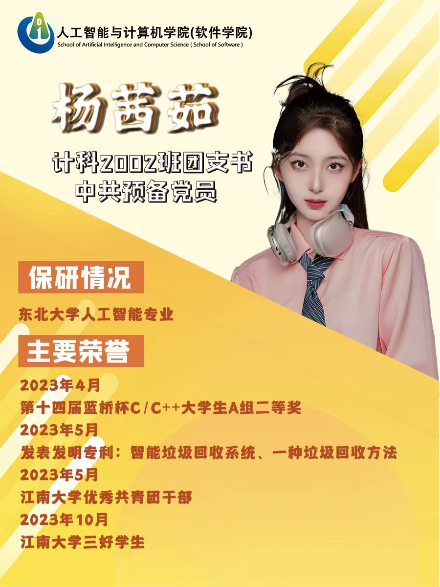 初冬时节,佳音终至。人工智能与计算机学院计算机科学与技术2002班班长马力、团支书杨茜茹、学委沈建露顺利保研至电子科技大学、东北大学、东南大学。他们是超合拍的工作搭子,驻守原点、探寻光点、奔赴终点是他们的初心与理想;铺筑双行线、明晰成长线、绘就服务线是他们的责任与担当。三位智能学子巧“三点三线”编译出江南大学“全能班三角”。