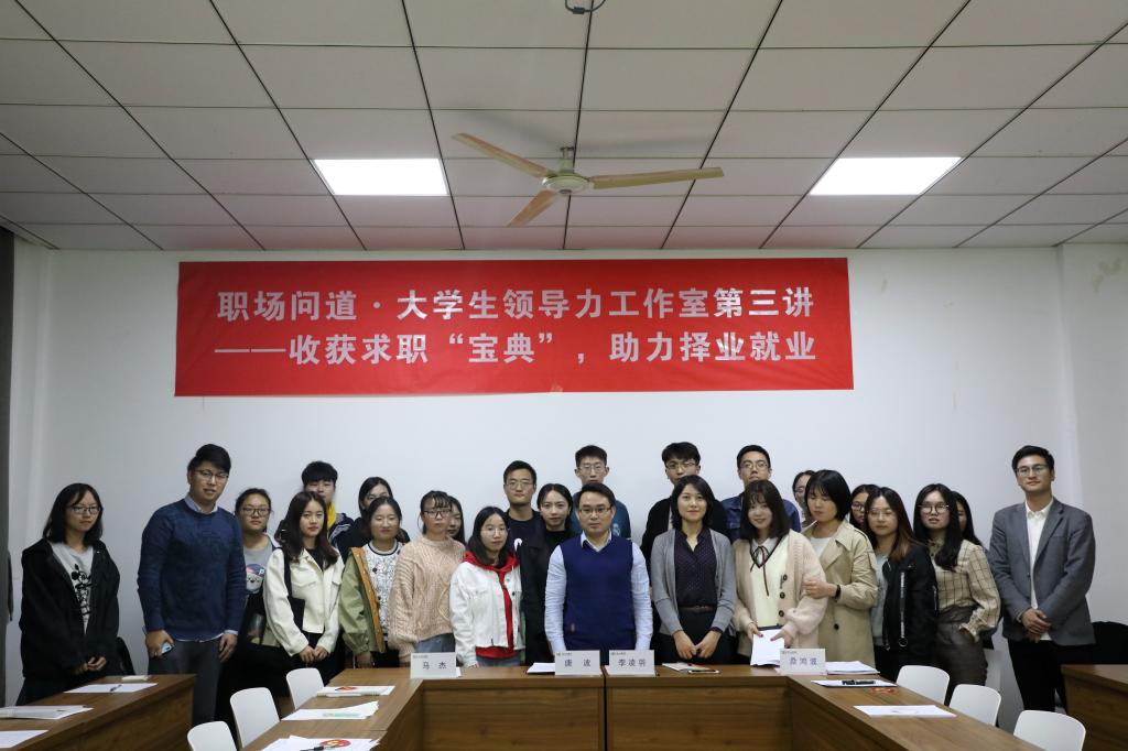 11月9日下午,由生物工程学院举办的“职场问道·大学生领导力工作室第三讲——收获求职‘宝典’,助力择业就业”活动在生工楼B417顺利举行。青岛蔚蓝生物集团有限公司能源酶项目部总经理唐波老师、诺维信(中国)投资有限公司研发李凌羽老师、生物工程学院辅导员马杰老师以及部分应届毕业生参加活动。活动由生物工程学院辅导员桑鸿波主持。
