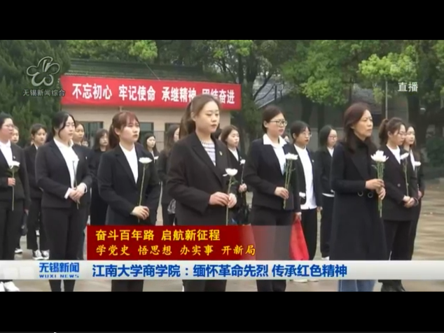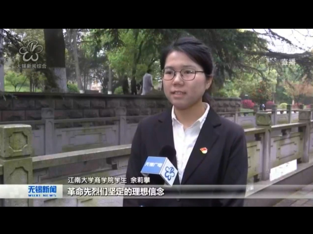 【无锡电视台4月5日】昨日,我校商学院师生一行50余人怀着对革命烈士无比敬仰的心情,在人民英雄纪念塔前庄严肃立,敬献花圈。无锡电视台《无锡新闻》栏目以《江南大学商学院:缅怀革命先烈 传承红色精神》为题,对此进行了报道。以下为视频截图: