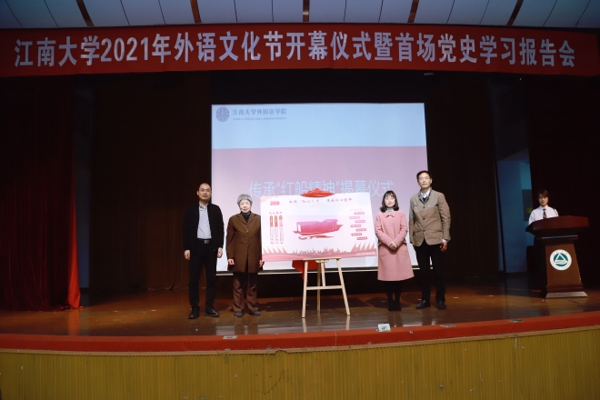 4月7日下午,江南大学2021年外语文化节开幕仪式暨首场党史学习报告会在南区大学生活动中心如期举行。外国语学院党委书记史志洪、校学生工作部(处)副处长俞立峰、校团委副书记单云婷、学院党委副书记刘伯贤、学院副院长顾琦一、“爱菲斯奖助学金”捐赠代表陆伟栋、“安达助学金”捐赠代表陈志钢、学院英语系主任孙志祥、日语系主任崔明姬、学院关工委常务副主任鲍国庆、学院分团委书记陆芳、相关学院学生代表以及我院500余名学生出席了本次活动。