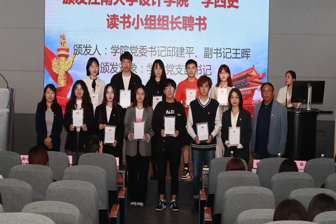 活动第一篇章“建队伍”,学院成立“学四史”读书班,邀请陈绪新作为学读书班授课导师“领读”四史;邀请学生党支部书记作为“学四史”读书小组组长“带头读”四史,邱建平指出:“正值世界读书日,设计学院组织成立四史读书班,要努力把阅读的境界升华为‘悦’读。”他勉励在场师生要多读书,读好书,走好路,以美为媒,增强文化自信。会上,邱建平为陈绪新颁发设计学院“学四史”读书班授课导师聘书。邱建平、王晖共同为学生党支部书记颁发设计学院“学四史”读书小组组长聘书。