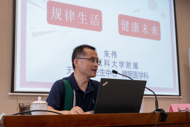 讲座之初,朱伟以中医古语、西方谚语为证,提出睡眠是最好的恢复剂。朱伟指出,睡眠医学这一新兴交叉学科的迅速发展契合了“健康中国2030规划纲要”,睡眠是人的本能,睡眠问题正引起愈发广泛的关注。接着,从具体的医学理论入手,朱伟向同学们讲解了睡眠的概念和生理功能等一系列知识。随后,朱伟介绍了历年世界睡眠日的主题,同时指出牺牲睡眠会对大脑造成损伤,以此劝诫同学们避免熬夜。这既展现了朱伟老师对世界与国家发展态势的把握,也表达了对同学们身心健康的关切。