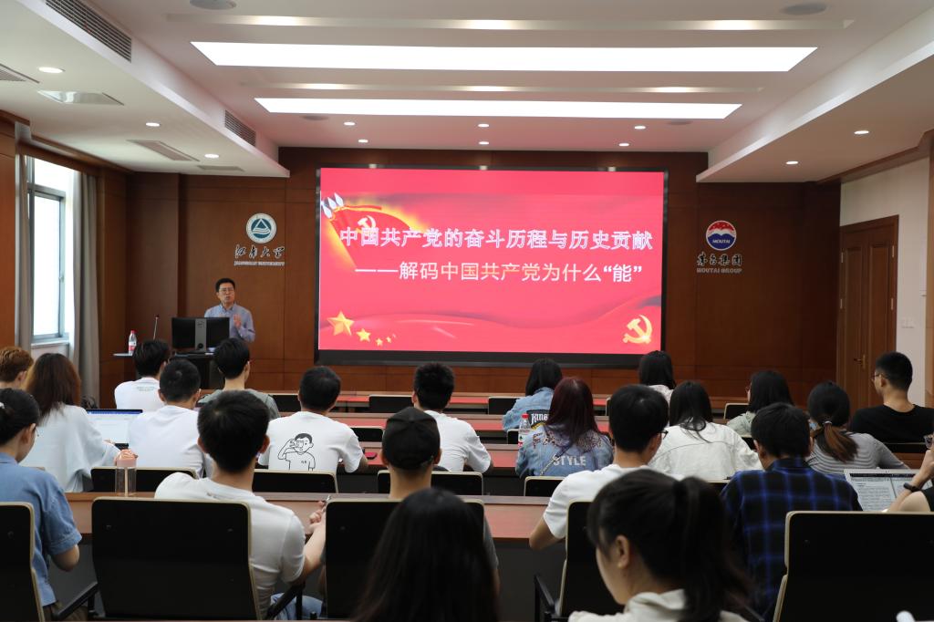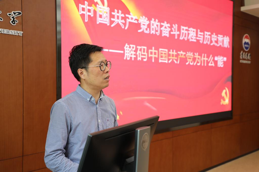 不忘来路,以史鉴今。5月21日,生物工程学院党委副书记周云龙在茅台厅为酿造微生物与应用酶学研究室党支部党员讲授党史学习教育专题党课《中国共产党的奋斗历程与历史贡献——解码中国共产党为什么“能”》。