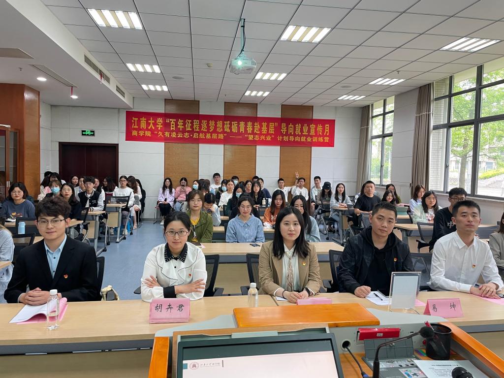 时值江南大学“百年征程逐梦想 砥砺青春赴基层”导向就业宣传月,商学院积极响应国家导向与社会需要,大力倡导毕业生扎根基层,于5月21日举办了“久有凌云志 启航基层路”—— “望志兴业”导向就业训练营讲座。校招生就业处副处长张婕英、学院党委副书记兼副院长徐静等出席,商学院2019届优秀校友易坤(江南大学首位江苏名校优生选调生)和2021届硕士毕业生王珏、金远培(录取为江苏省2021年选调生)作分享发言。