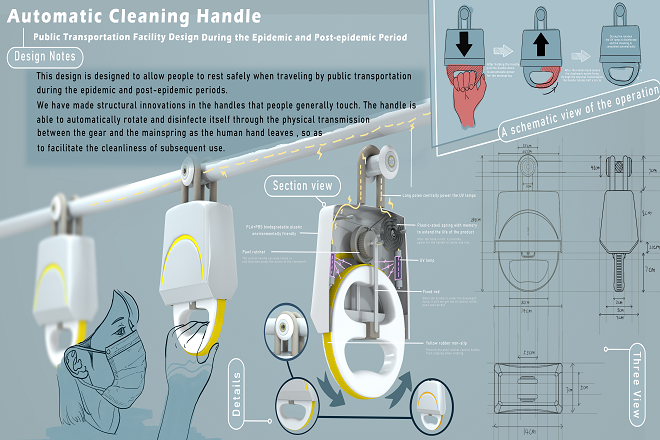 作品“Automatic Cleaning HandlePublic hygiene device”设计针对疫情及后疫情时期,为促进城市经济恢复,稳定民心,使人们在出行乘坐公共交通工具时,能够放心,将人们普遍接触的拉手进行了一系列结构创新,使其能够通过物理齿轮发条传动效果,实现拉手在人手离开后自动旋转消毒,以便后续使用的清洁性。在消毒方面,采用了紫外线消杀,消毒更加彻底安全,且物理结构之下,此款产品环保安全,在材料的选择上,选择了PLA+PBS可降解塑料,及具有记忆性的塑钢,在环保之余增长了产品的使用周期,以便于减少资源浪费,环境污染现象。