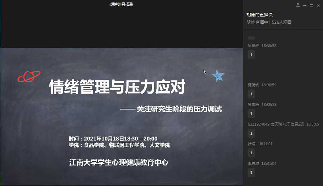 为进一步提高研究生群体心理健康意识,10月18日晚,物联网工程学院举办线上研究生新生心理健康教育讲座。本次讲座学院特意邀请了生物工程学院胡博老师做《情绪管理与压力应对》主题分享,学院2021级全体硕博生参加了活动。