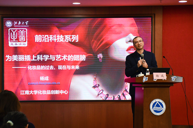 11月24日下午,至善讲坛“前沿科技”系列讲座——《为美丽插上科学与艺术的翅膀——化妆品的过去、现在与未来》在图书馆510报告厅顺利举行。本次讲座邀请江南大学博士生导师、化妆品创新中心主任杨成教授主讲。杨成从“美的历程、美丽科技、美丽艺术、美丽最前沿”四个方面将化妆品的前世今生娓娓道来,讲述了学科交叉、文理交融对化妆品创新方面的影响,进一步加深了同学们对化妆品的了解。