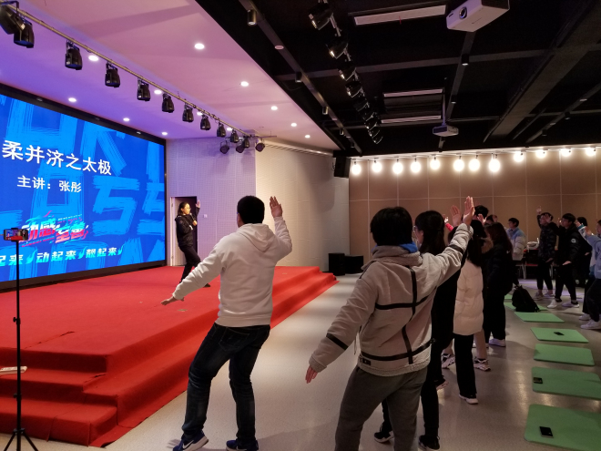 12月1日下午,动感至善之“动感课堂”第五期《刚柔并济之太极》在北区大学生活动中心F105举行。本期“动感课堂”由江南大学体育部张彤副教授担任“嗨课”主讲嘉宾,并邀请专业健身“嗨课教练”带领60名同学参与体验。活动由人文学院辅导员赵将主持。