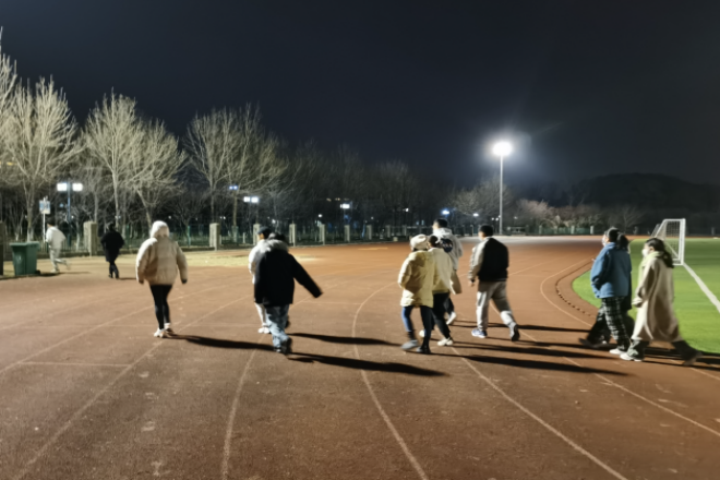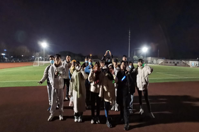 各个参赛者挥舞着“五彩之光”奔向西北操场、体育中心、图书馆和第二教学楼四个打卡点。绿茵场上,教学楼前,色彩飞舞,人声鼎沸,点点荧光照亮黑夜。抵达终点西北操场后,工作人员为大家发放腊八粥和奖状,并合影留念,为来年祈福。愿今后的日子像腊八粥一样丰富多彩。荧光夜跑于当晚九点结束,但是教学楼中的学子,图书馆里的读者,他们“奔跑”的脚步永不停息,“追光”的初心未曾改变。