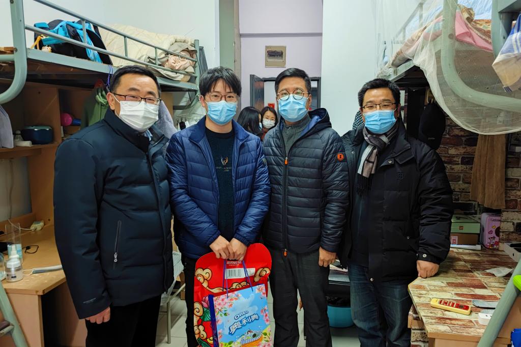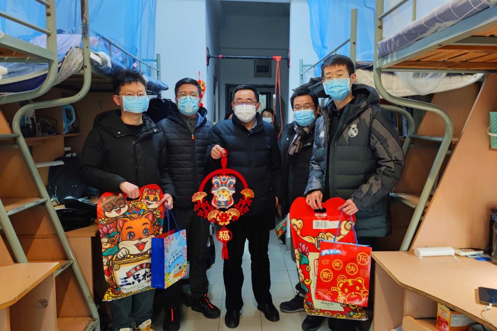 许正宏带队走访宿舍并与学生亲切交谈,提醒同学们要提高安全意识,遵守留校管理办法,加强个人防护;要保持顺畅沟通,及时有效与家长、导师、辅导员联系,有需求主动提,有情况赶紧报,有困难立即帮,要有序规划假期,注重劳逸结合,过一个收获年、平安年、幸福年。一行人为同学们送上精美慰问品和新春对联。