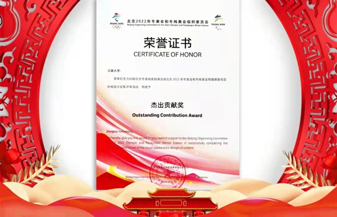 江南大学全力协助北京冬奥组委圆满完成北京2022年冬奥会和冬残奥会制服装备视觉外观设计征集任务,被授予“杰出贡献奖”。