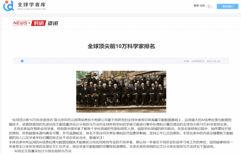 此次“全球顶尖前10万科学家”是根据学者发表的学术论文及其深度分析结果作为核心评分依据。在论文评估计分过程中,将Metrics期刊评分、论文被引频次、论文类型、作者署名排位(论文贡献度)、作者H指数等多种反映论文作者学术影响力的潜在重要因素综合考虑,设置权重,力求透过论文的诸多核心因素精确评价学者的学术影响力。全球学者库的算法能够覆盖全球所有领域的学者,能够区分同名同姓的不同学者(甚至同机构同院系的同名学者)、并能把同一学者的佚名及学术迁徙进行合并,是读者了解领域专家、追踪研究前沿、人才价值评价的重要参考依据。