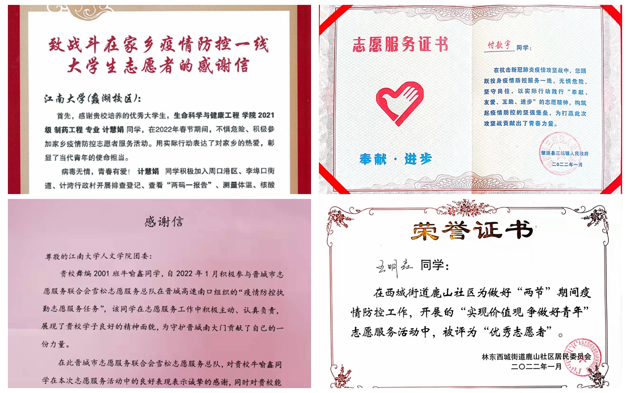 截至目前,我校抗疫志愿者陆续收到来自全国各地政府部门的感谢信和荣誉证书,这充分肯定我校青年学子在当地疫情防控志愿服务中的表现。开学返校后,江大青年们又积极投身返校志愿服务,总共有935人次参与到开学返校、疫苗接种、核酸检测等防疫志愿服务中去,他们用实际行动筑起了一道道守护师生健康安全的青春防线。