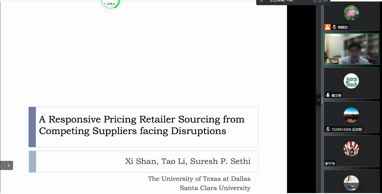 近期,“商学大讲堂”系列要闻第187讲在腾讯会议线上举行。圣克拉拉大学莱维商学院李涛副教授作为主讲嘉宾进行题为“响应式定价的零售商从多个具有竞争性供应商处采购的供应链管理问题”的要闻。本次讲座由商学院管理科学与工程系主任曹文彬副教授主持,商学院教师和各专业研究生100余人参加了本次学术交流。