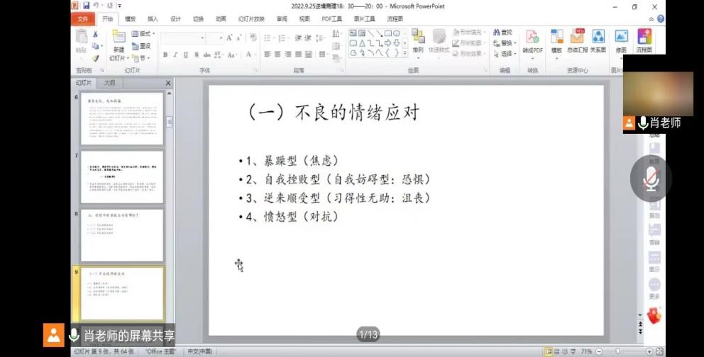 讲座开始,肖凌燕首先向新生们分析了“逆境”的三大特点:常态普遍性、难以预测性、对立统一性,并指出当今社会存在的不良情绪应对,分别为暴躁型、自我挫败型、逆来顺受型,愤怒型,并通过生动形象的例子来说明不同类型心理问题的特点和危害。肖老师普及到心理健康是指心理的各个方面及活动过程处于一种良好或正常的状态,它关系到人的健康和成长。进入大学, 意味着新生们获得了新的发展机遇,但同时也面临着新的挑战,而健康的心理状态是迎接一切挑战的基础,能正确识别并应对不同的心理问题则是战胜一切挫折的关键。
