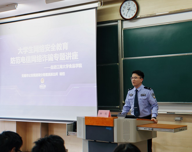 为切实增强大学生网络安全意识、提高其防范网络诈骗能力,10月10日,食品学院2022级本科新生网络安全教育专题讲座在第一教学楼B103教室顺利举行。本次活动特邀无锡市公安局滨湖分局雪浪派出所警官杨恺作报告,2022级本科新生辅导员张任担任主持。