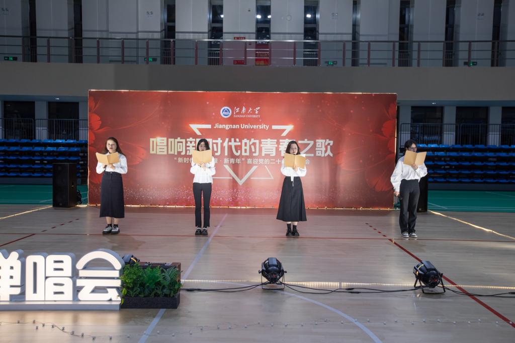 本次活动由青春逢盛世、奋斗正当时和逐梦向未来三个篇章构成。活动由大学生艺术团欢快洋溢的舞蹈节目开场,以青春靓丽的风貌,展现江南学子青春风采。艺术团还带来了吉他独奏、乐队演唱等节目,一曲古琴独奏《阳关三叠》更是让在场观众领略了中华传统民乐的高雅与悠长。人文学院音乐师范专业的同学们带来《裹着心的光》抒发青年人对梦想的执著与追求,合唱《星辰大海》更是激发青年奔赴梦想,向着广阔天地扬帆起航。马克思主义学院的四位研究生同学带来朗诵节目《青春》,再读这篇马克思主义传播者李大钊先生于1916年在《新青年》杂志上发表的篇章,激励青年学子怀揣爱国主义理想,为民族复兴而觉醒,勇于担负起再造世界、重塑时代的历史重任。他们的朗诵深沉有力,激昂澎湃,将全场活动推向高潮。活动在人文学院同学们演唱的《明天会更好》中进入尾声,大家共同唱响这首歌,为党的二十大胜利召开而庆贺,为二十大报告所擘画的新征程而振奋,也为祖国明天会更好而祝福。活动结尾,主持人以二十大报告寄语青年的话激励大家要坚定不移听党话、跟党走,怀抱梦想又脚踏实地,敢想敢为又善作善成,立志做有理想、敢担当、能吃苦、肯奋斗的新时代好青年,让青春在全面建设社会主义现代化国家新征程的火热实践中绽放绚丽之花。活动在“唱响新时代的青春之歌”齐声欢呼中圆满帷幕。