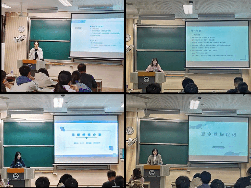 分享环节,分别被江南大学、华中科技大学、上海交通大学、中国科学技术大学、浙江大学拟录取的宋敏霞、罗舒元、朱小青、孙丹、李梦轩五名同学依次上台交流经验。她们根据亲身经历,从保研条件、时间节点、材料准备、联系导师和面试要求等多方面进行了详细介绍,并耐心细致地解答了同学们提出的疑惑,给予了很多中肯的建议。