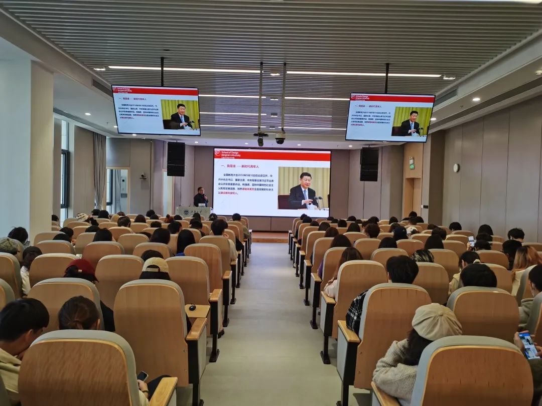 为庆祝党的二十大胜利召开,深入学习宣传贯彻党的二十大精神, 10月31日,设计学院党委书记邱建平来到江南大学东氿校区,为2022级设计学院研究生新生讲授“不忘初心,设计未来”的思政课。