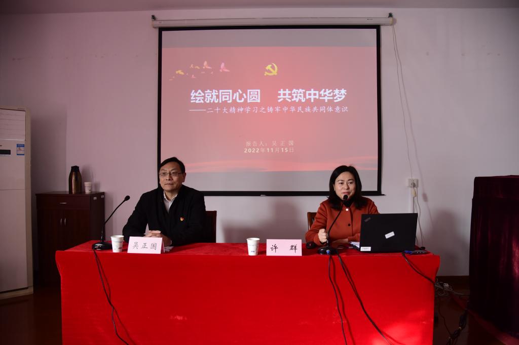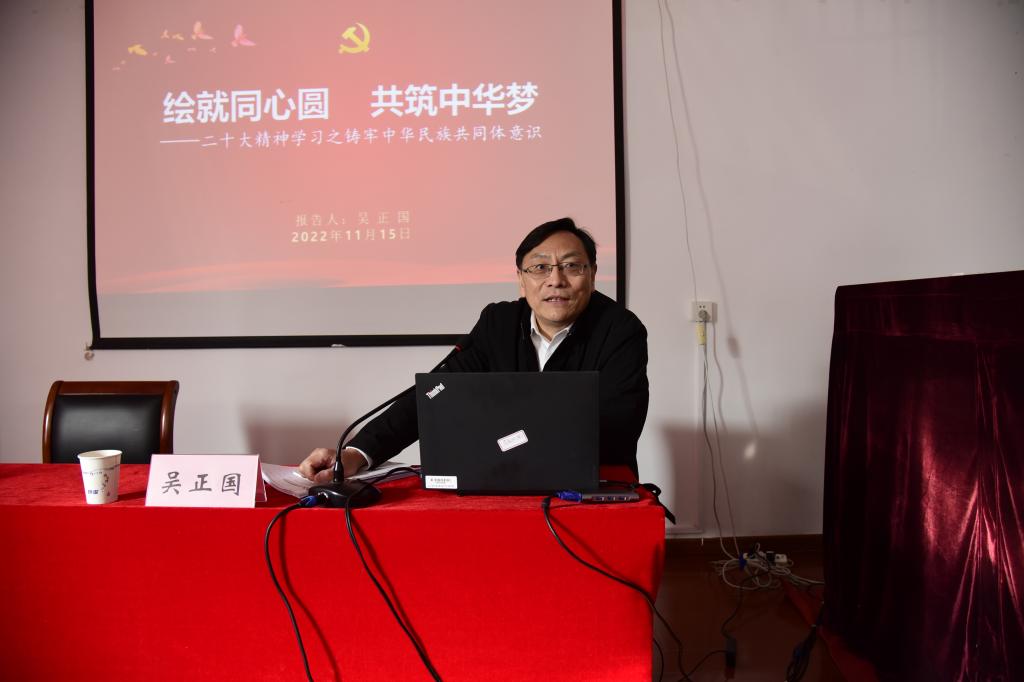 吴正国首先领学了党的二十大精神概览,他从大会的意义与主题、报告的主要内容、过去五年工作、新时代十年三件大事、中国式现代化的中国特色、中国式现代化的本质要求、总的战略安排等方面作了阐释。接下来吴正国解读了铸牢中华民族共同体意识,对中华民族共同体意识理论提出、基本内涵、促进各民族深度交往交流交融作了分析和解释,最后他就边疆治理与党的治藏方略作了分享。吴正国的讲座内容生动,观点精准到位,他结合个人三年的援藏经历,用具体的案例和数据,以及个人的体验感受,让我们深刻感受到党坚持把马克思主义关于边疆治理的科学理论和马克思主义民族理论与具体实际相结合,不断促进各民族的平等团结和繁荣发展,始终同人民同呼吸、共命运、心连心,不断巩固全国各族人民大团结,形成同心共圆中国梦的强大合力。