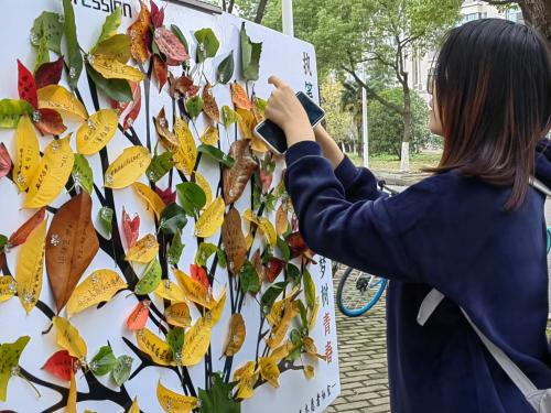 一片树叶,一声问候;一树秋色,一墙温情。11月20日,恰逢“世界问候日”,法学院在浩苑和榴园宿舍区举办了“执笔拾秋色,以梦树青春”活动,让同学们相互问候、相互交流,在拾叶、思考、分享、传递的过程中倾诉内心,勇于表达。本次活动吸引了400余名同学参与,同学们纷纷传递自己的心愿树叶,将光秃的树干共同描绘成色彩缤纷的“心愿树”,见证了同学们最诚挚的问候和最美好的梦想。