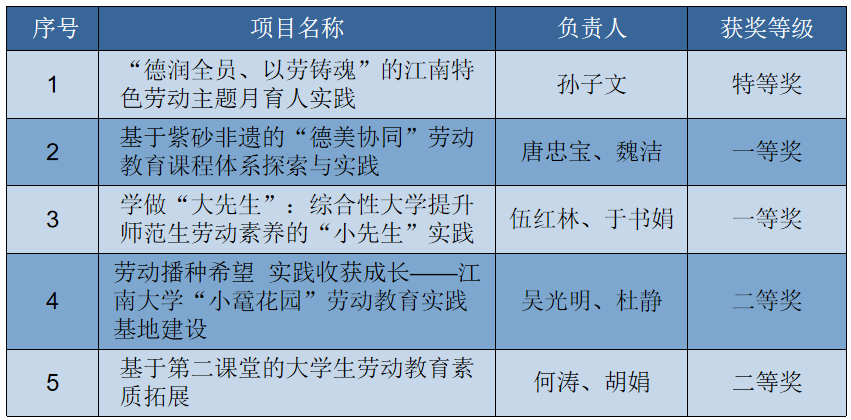 近日,江苏省高等教育学会发布了《关于2022年江苏省高等学校劳动教育优秀实践项目评选结果的通知》(苏高教会〔2023〕5号),我校申报的5个项目均获奖,其中特等奖1项,一等奖和二等奖各2项,江南大学荣获优秀组织奖,获评总数位居全省高校前列。