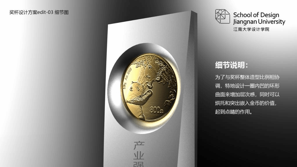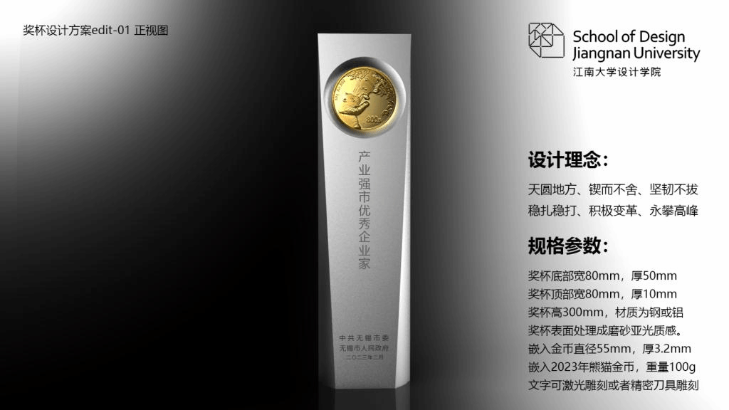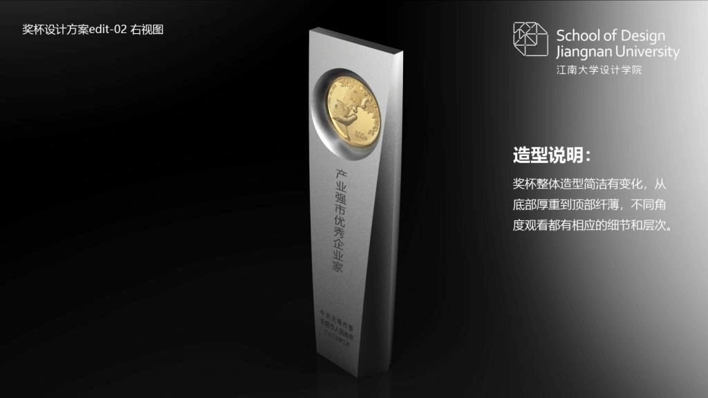 受无锡市工业和信息化局委托,设计学院副教授刘颜楷承担了本次大会“产业强市优秀企业家”荣誉奖杯的设计工作,以“纪念碑和丰碑为原型,融入江南中式之意境,体现科技感和现代感”的设计理念,通过简洁而富有变化的立体造型和细节层次感,表现无锡优秀企业家尚德务实、坚韧不拔、锲而不舍、稳扎稳打、积极变革、勇攀高峰的优秀品格。整个过程从创意、设计、定稿、制作到成品,都体现了设计学院较高的设计水平和设计理念,受到委托单位的高度评价。