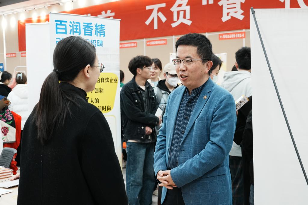食品学院党委副书记、副院长李雷,分团委副书记李琳以及辅导员杨光宝、陈婷、胡卉君等来到会场,与企业充分交流,了解行业招聘形势和用人单位需求。李雷鼓励同学们树立积极的求职观念,精准分析自身情况,努力与企业实现“双向奔赴”。