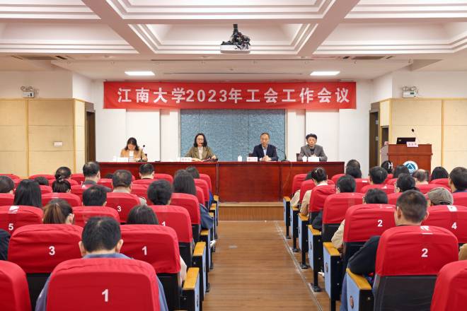 4月24日下午,江南大学2023年工会工作会议在文浩馆205会议室召开,校党委常委、副校长张影陆,校党委常委、统战部部长朱飞等出席会议,校工会委员会委员、校工会经费审查委员会委员、各分工会主席、副主席、受表彰的2022年度工会工作先进个人等参加了会议。