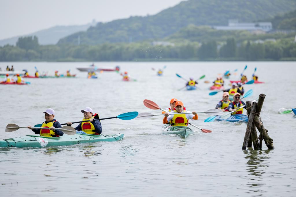 现场培训后,各队很快掌握了皮划艇的操作动作要领,队员们纷纷摩拳擦掌,卯足劲立即投入比赛。紧张的比赛中,因为技术或者体力原因,赛艇的速度有快有慢,排位也在赛程中瞬息万变,但每一位队员在蠡湖风浪中的姿势都是奋力向前,体育精神在比赛中得到了淋漓尽致的诠释与展现。湖边观赛的拉拉队爆发出此起彼伏的加油声,激励着每一支赛队乘风破浪,全部胜利冲到了终点。