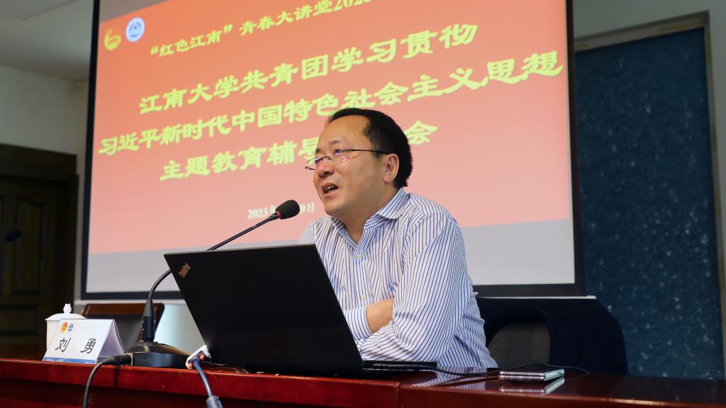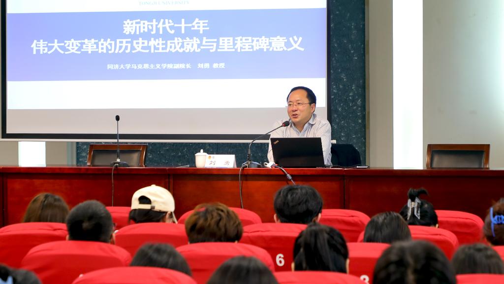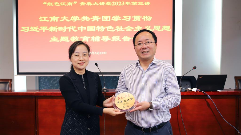 会上,同济大学马克思主义学院副院长、教授、博士生导师,中央马克思主义理论研究与建设工程专家组主要成员刘勇以《新时代十年伟大变革的历史性成就与里程碑意义》为题作辅导报告。报告从深刻认识新时代十年伟大变革的社会背景、深刻认识新时代十年的历史性成就历史性变革以及深刻认识新时代十年伟大变革的里程碑意义等三个方面,深刻阐明了新时代的原创性思想、变革性实践、突破性进展、标志性成果。最后,校团委副书记单云婷为刘勇教授颁发了“红色江南”青春大讲堂纪念牌。