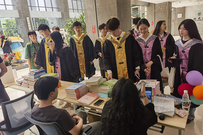 捐赠书籍从考研资料到课程笔记,从国学名著到文学小说,学长学姐们的暖心寄语,承载着对学弟学妹们的希望,他们用爱心传出一份情,期待着这些书籍能够在学弟学妹们的笔下生出崭新的江南之花。本次活动共计受捐图书400余册,捐出图书200余册,捐赠参与人数150余人。活动结束后,捐赠的书籍摆放在A210、A310自修室内图书漂流架上,供同学们自由取阅,让知识与爱传递下去。