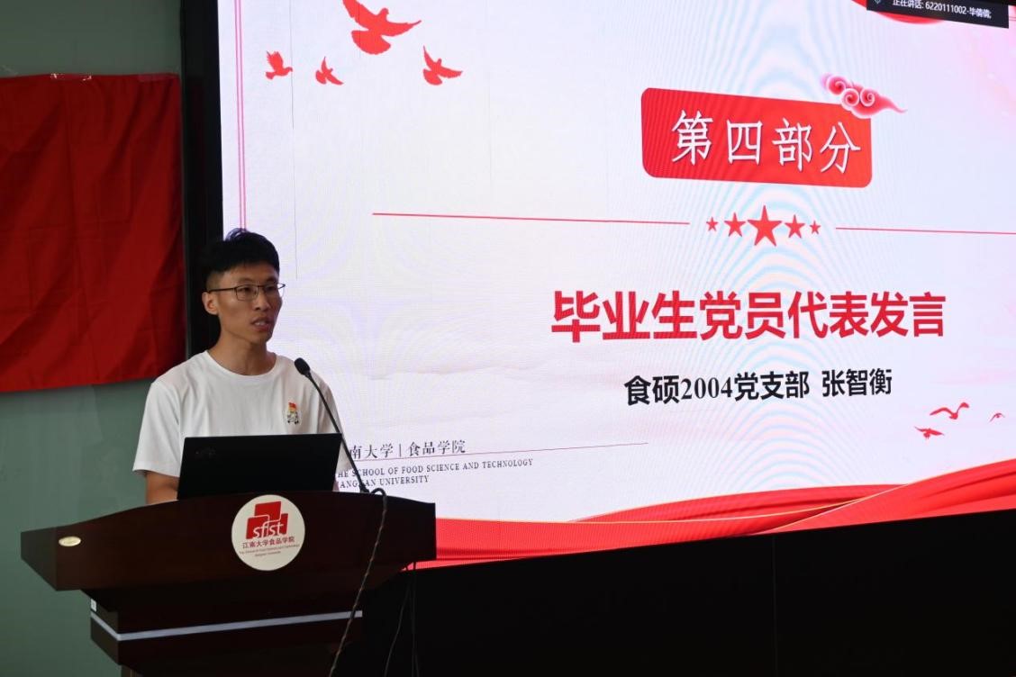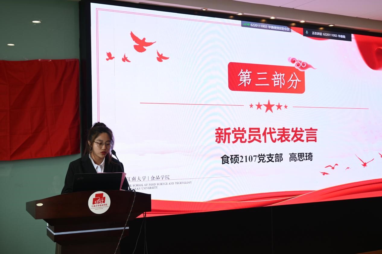 食硕2004党支部张智衡同志作为毕业生党员代表发言。他认为如何应对百年未有之大变局,是每一名青年党员必须思考的重要问题。他坚信毕业生们都能练就过硬本领,在实践中求真知,在发展中建新功。食硕2107党支部高思琦同志作为新党员代表发言。她表示将坚定理想信念,牢记党的宗旨,时刻不忘党员先锋模范作用,坚持用习近平新时代中国特色社会主义思想指导实践、增强本领。