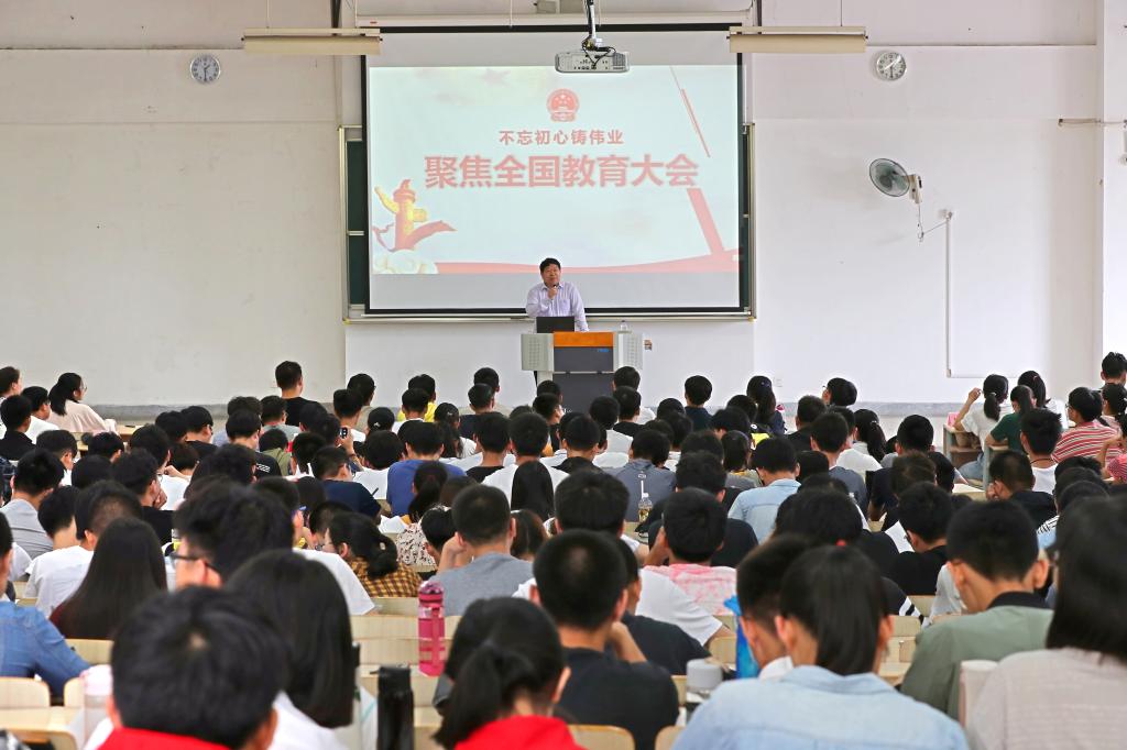 首先,陈坚带领同学们回顾了改革开放以来党中央、国务院召开的四次全国教育工作会议,追溯了历次会议的历史背景、主要内容、发展目标。接着,他围绕新时代全国教育大会的背景和概述、贯彻落实全国教育大会精神、推动学校内涵式发展三个部分展开了深入的讲解。他强调了党的十八大以来,各级、各类高校都面临着“培养什么人、怎样培养人、为谁培养人”这一根本问题,当今党和国家事业的发展迫切需要高等教育、科学知识和优秀人才。他传达了本次全国教育大会的主要精神,指出了新形势下的教育方针,阐明了教育事业的当代意义,高度评价了教师的贡献和地位。他详细阐释了九个“坚持”,突出强调了“坚持把立德树人作为根本任务”“坚持把服务中华民族伟大复兴作为教育的重要使命”,明确了培养社会主义建设者和接班人是我们教育的根本任务。陈坚还指出,在座的同学都是新时期国家亟需的优秀人才,不论在何种岗位,都应以实现中华民族伟大复兴为己任,树立正确的世界观、人生观、价值观,坚定理想信念,增强奋斗精神,为国家和社会的发展做出贡献。