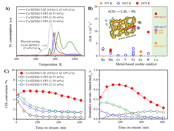 该反应自1993年发现以来,至今已经发表近千篇论文围绕钼基催化剂开展研究,研究的焦点是阐述催化剂的活性中心、反应机理和解决催化剂高温条件下不可控活化导致的催化剂失活,并认为其它金属的催化活性显著低于钼基催化剂。经过长期的深入研究,虽然普遍认为碳化钼(MoCx)是活化C-H键的活性中心,然而,由于其催化剂制备和独特的活性相形成过程,即采用浸渍法将前驱体Mo7O246-负载到分子筛上,初始的前驱体聚集在分子筛外表面,随后在高温焙烧阶段软化扩散进入分子筛孔道内,不可避免导致形成钼物种的多样性,对反应机理的精确阐述和揭示影响C-H键活化的关键因素带来困难。